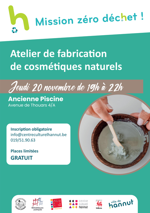 Prenons soin de notre belle planète ensemble en adoptant des gestes écologiques au quotidien. Pour ce prochain atelier zéro déchet, nous vous invitons à créer différents produits cosmétiques naturels à partir d'ingrédients courants que nous avons tous à la maison. Une intervenante de Natagora sera présente pour vous guider et vous montrer comment fabriquer vos propres produits de beauté respectueux de l'environnement. Les places sont limitées et réservées en priorité aux Hannutois.es et aux membres du Collectif logement.